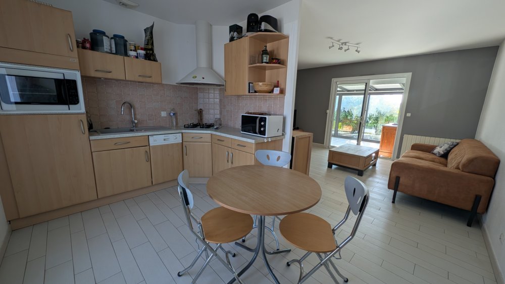 Cette maison plain-pied se compose d’une cuisine aménagée et équipée, d’un salon/séjour lumineux et d’une très belle véranda. Elle dispose également de deux chambres confortables, d’une salle d’eau et de toilettes séparées. Un garage attenant de 25 m² avec galetas vient compléter ce bien et offrir un espace de rangement supplémentaire.